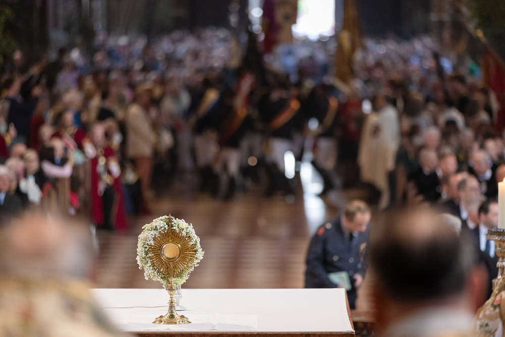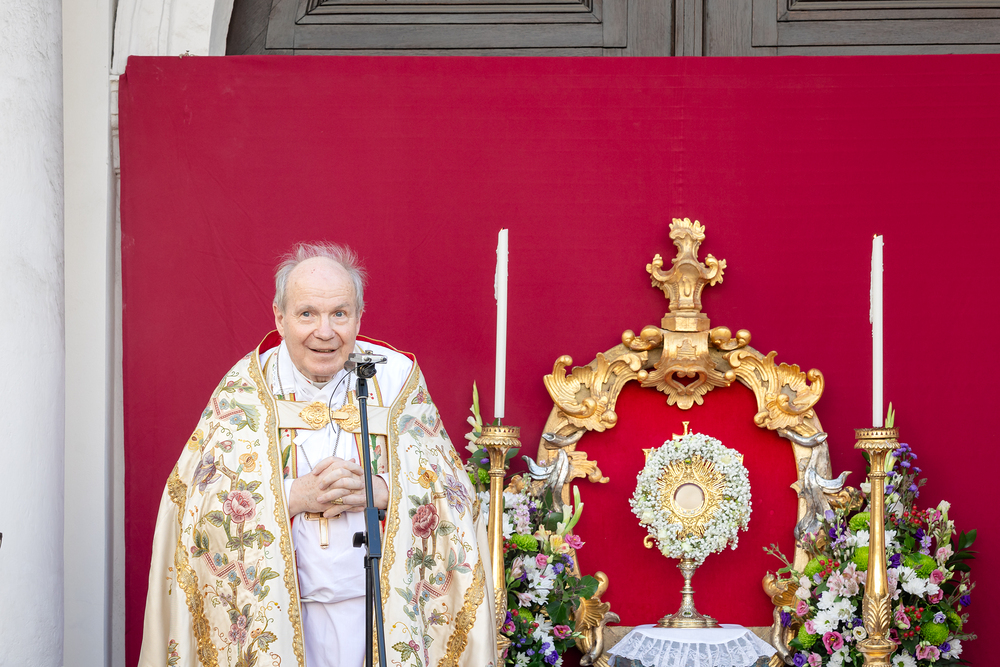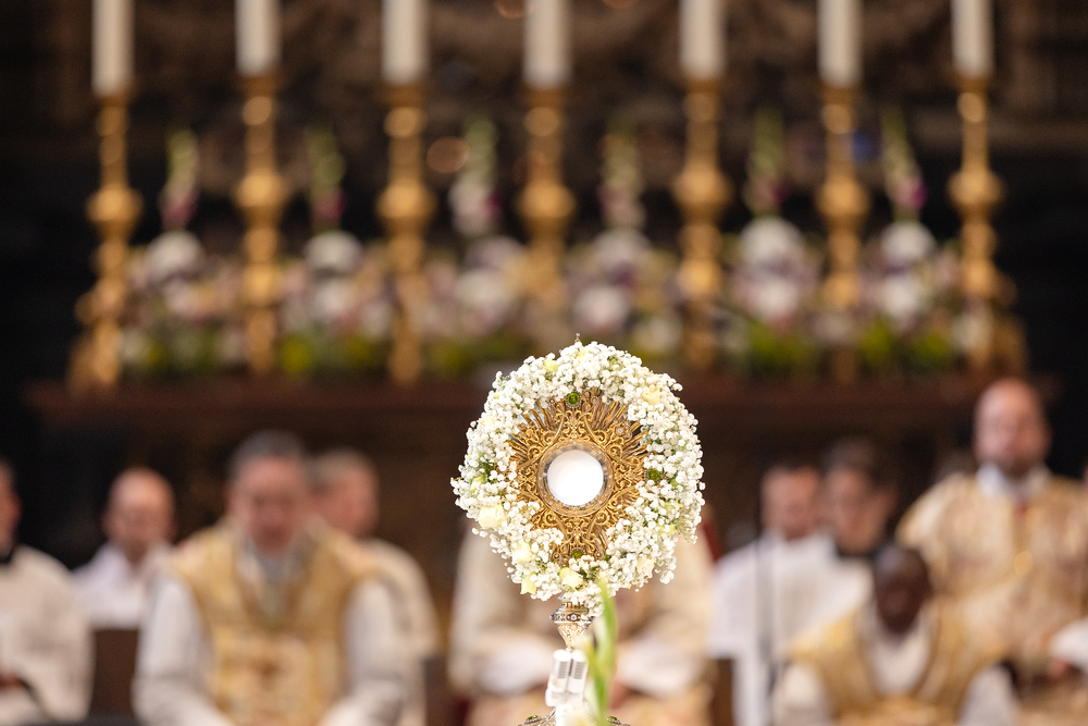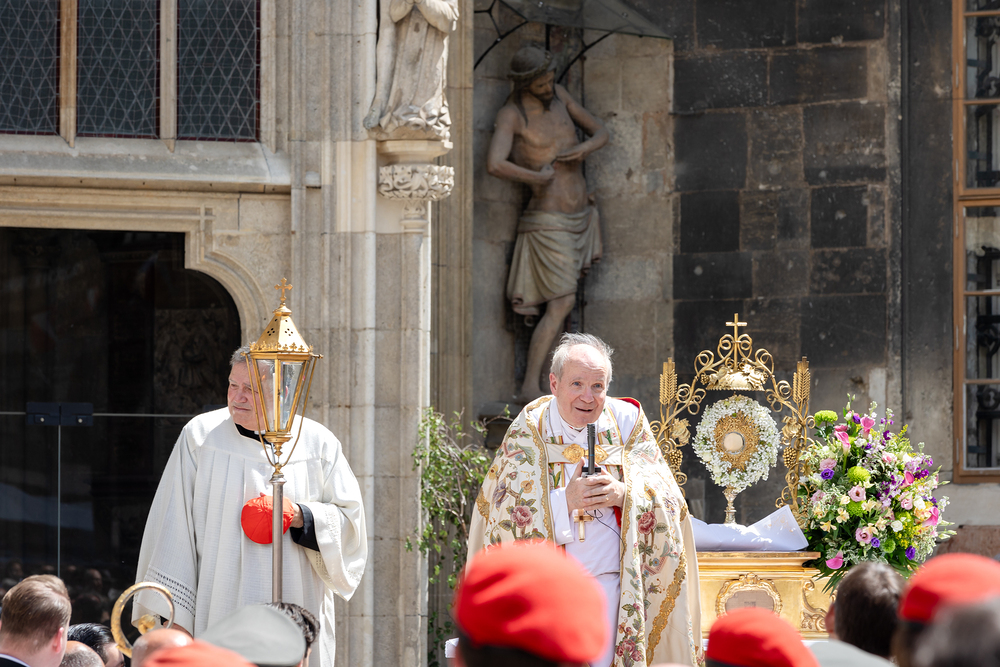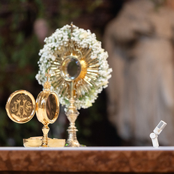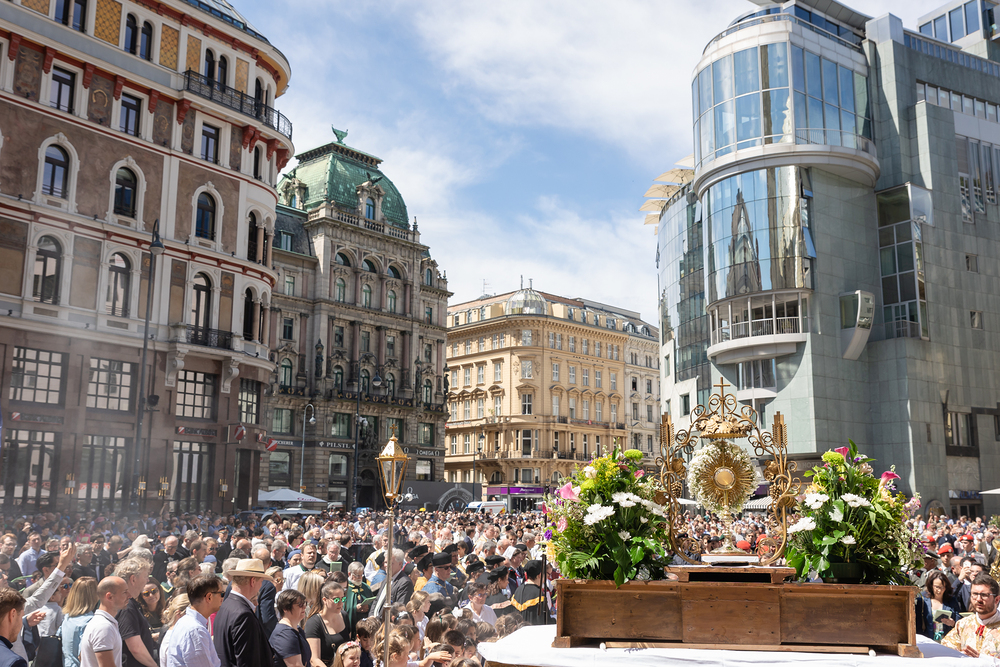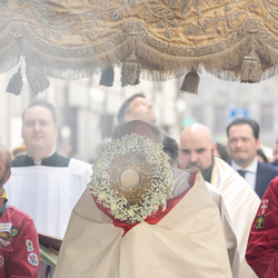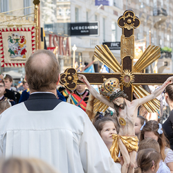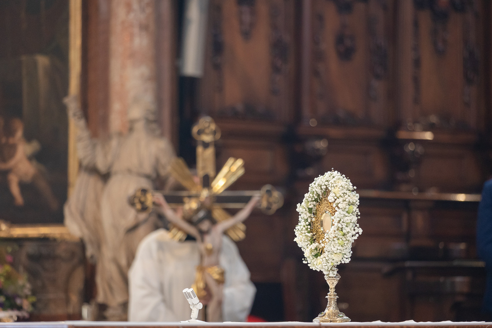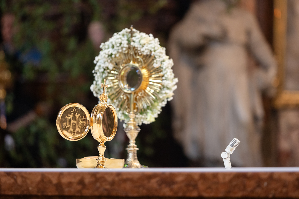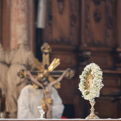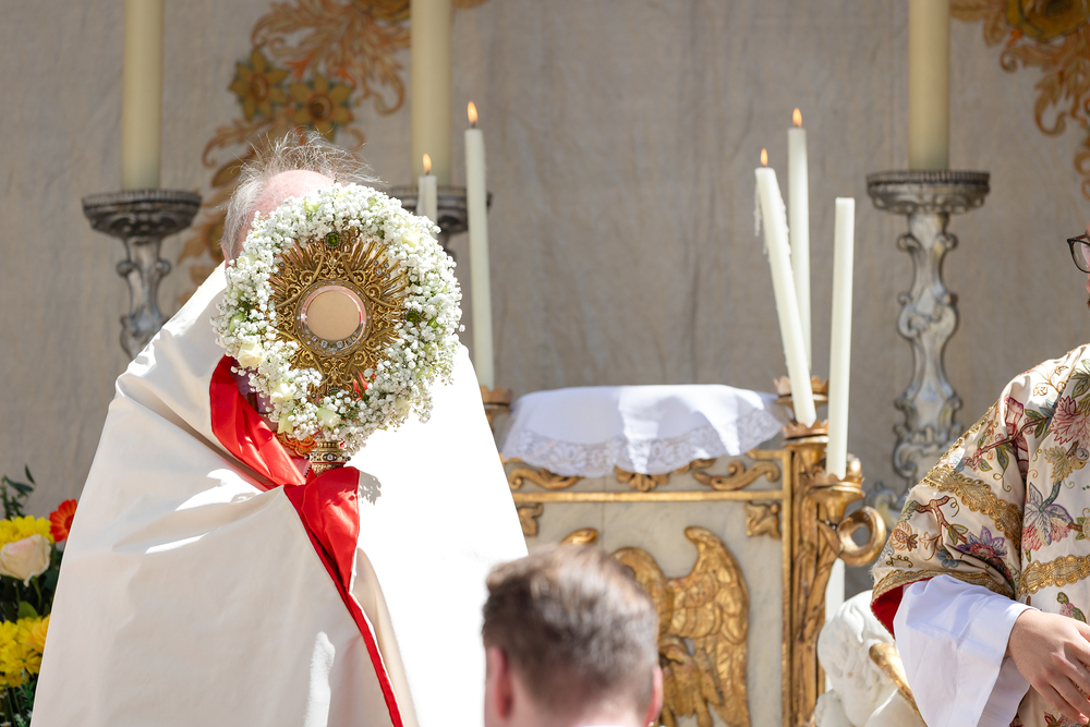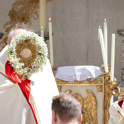 Zu Fronleichnam bringen wir Katholiken öffentlich unseren Glauben zum Ausdruck, dass Gott in Brot und Wein mitten unter ihnen ist. Als sichtbares Zeichen wird eine reich verzierte Monstranz mit einer geweihten Hostie in feierlicher Prozession durch die Straßen getragen.