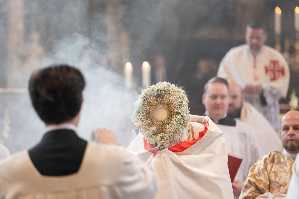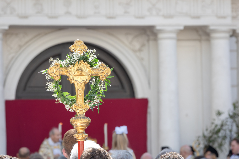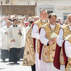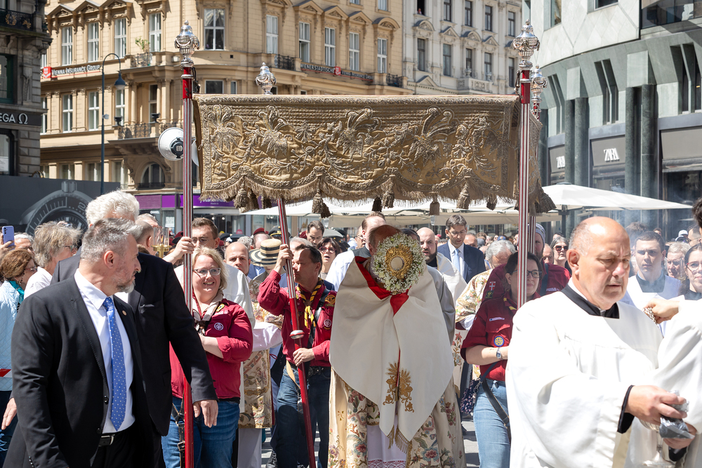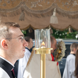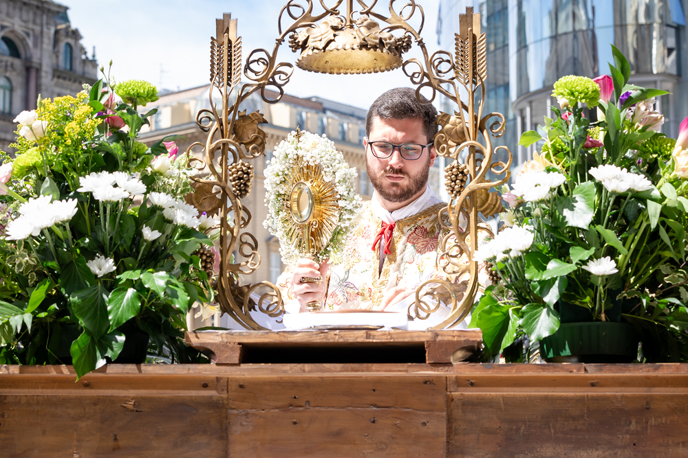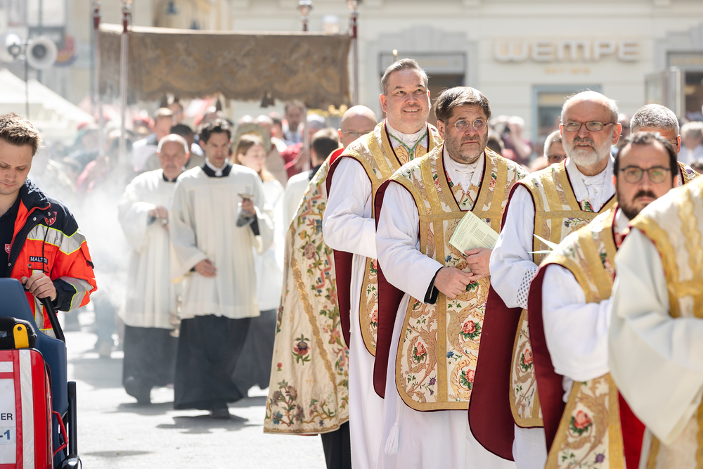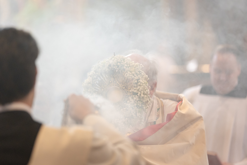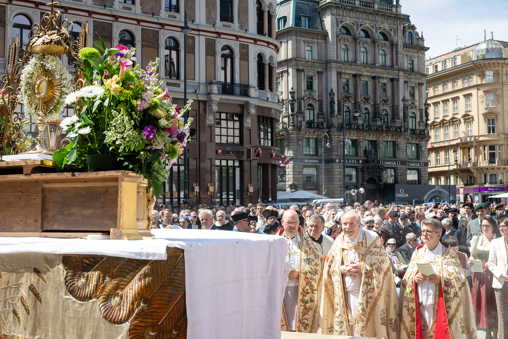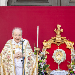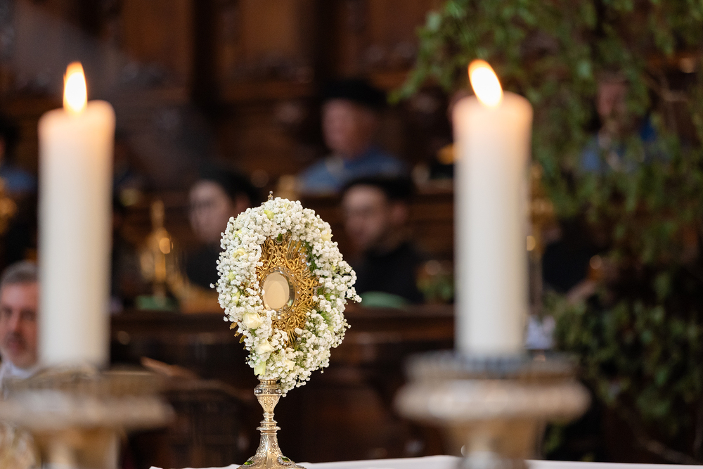 Zu Fronleichnam bringen wir Katholiken öffentlich unseren Glauben zum Ausdruck, dass Gott in Brot und Wein mitten unter ihnen ist. Als sichtbares Zeichen wird eine reich verzierte Monstranz mit einer geweihten Hostie in feierlicher Prozession durch die Straßen getragen.
