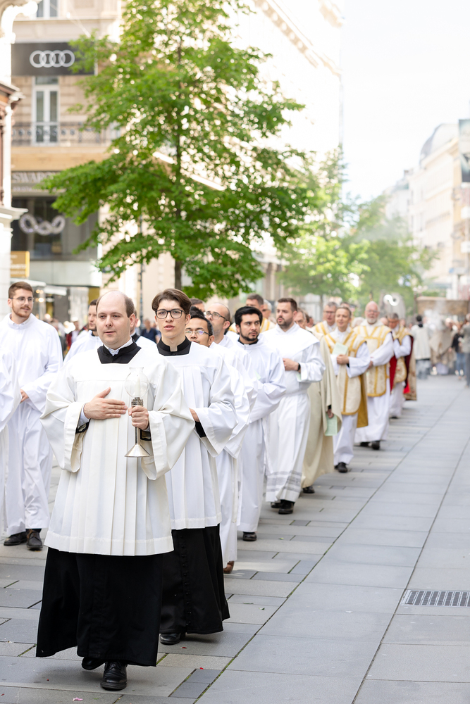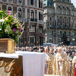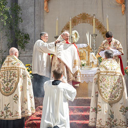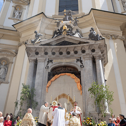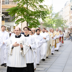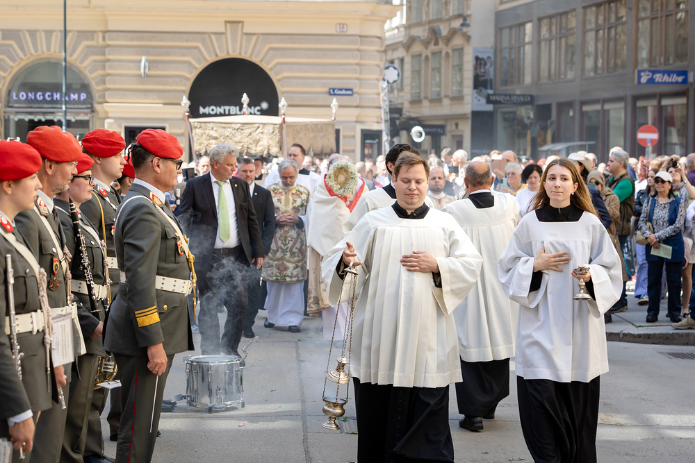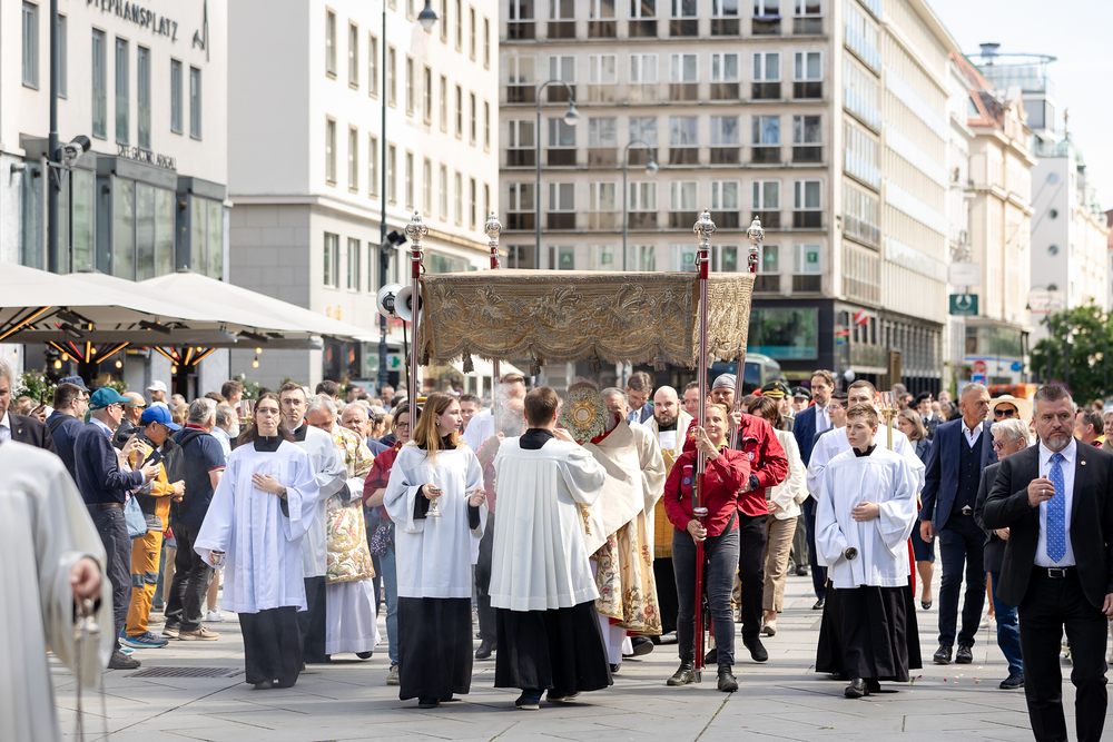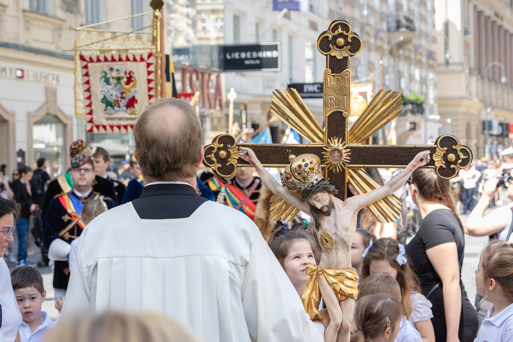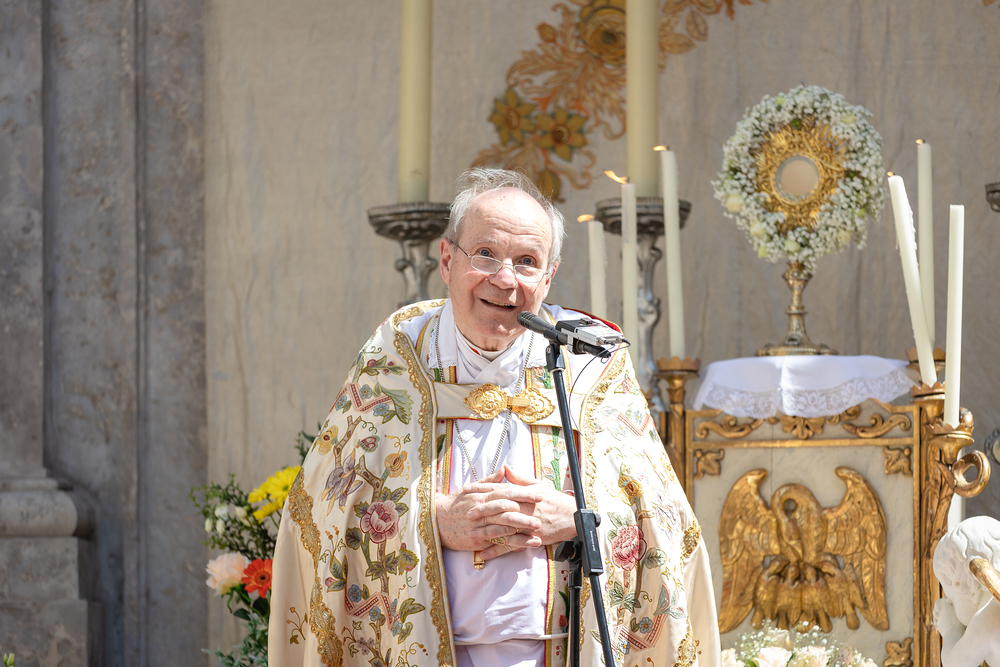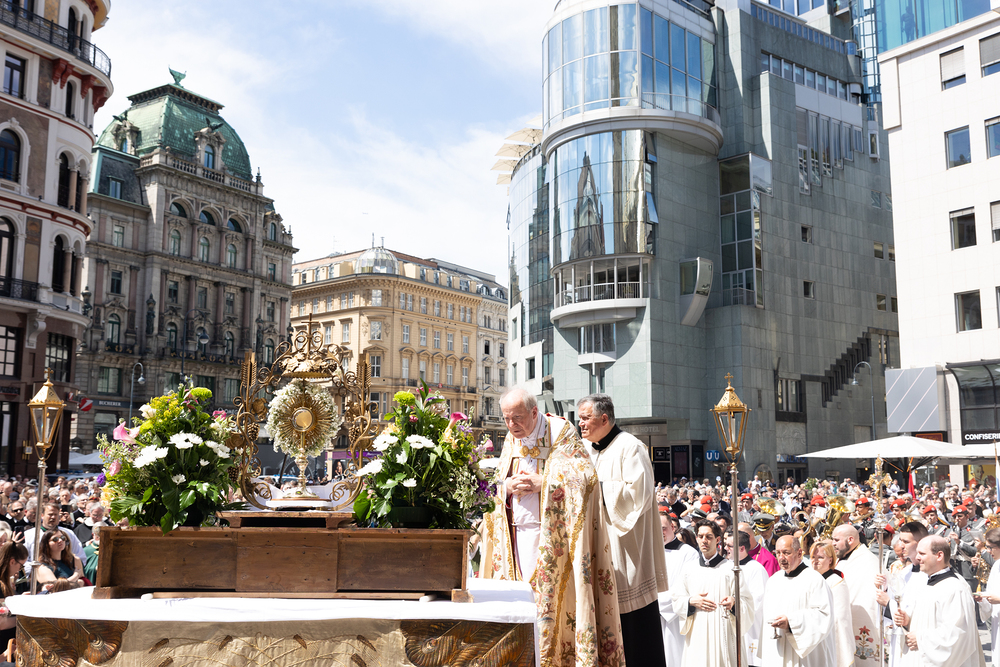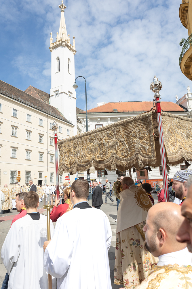 Zu Fronleichnam bringen wir Katholiken öffentlich unseren Glauben zum Ausdruck, dass Gott in Brot und Wein mitten unter ihnen ist. Als sichtbares Zeichen wird eine reich verzierte Monstranz mit einer geweihten Hostie in feierlicher Prozession durch die Straßen getragen.