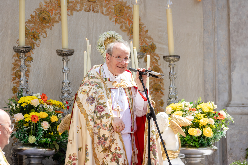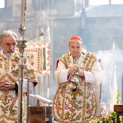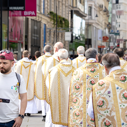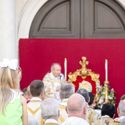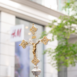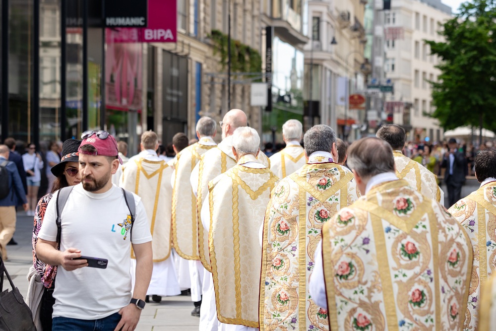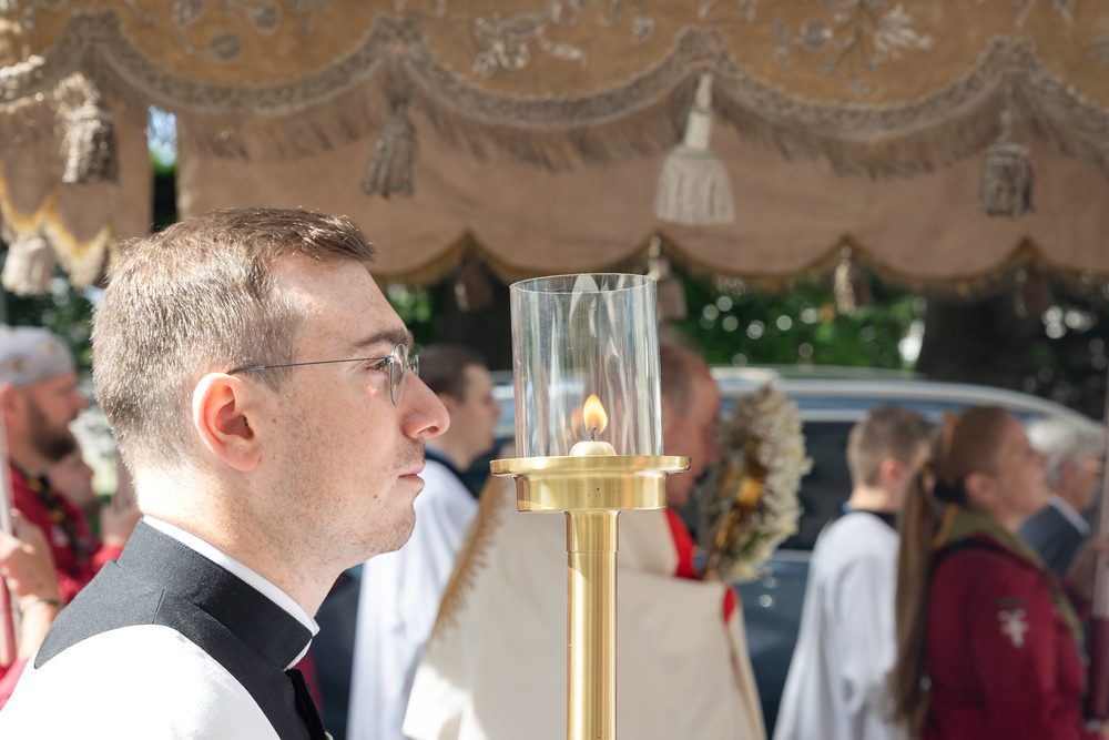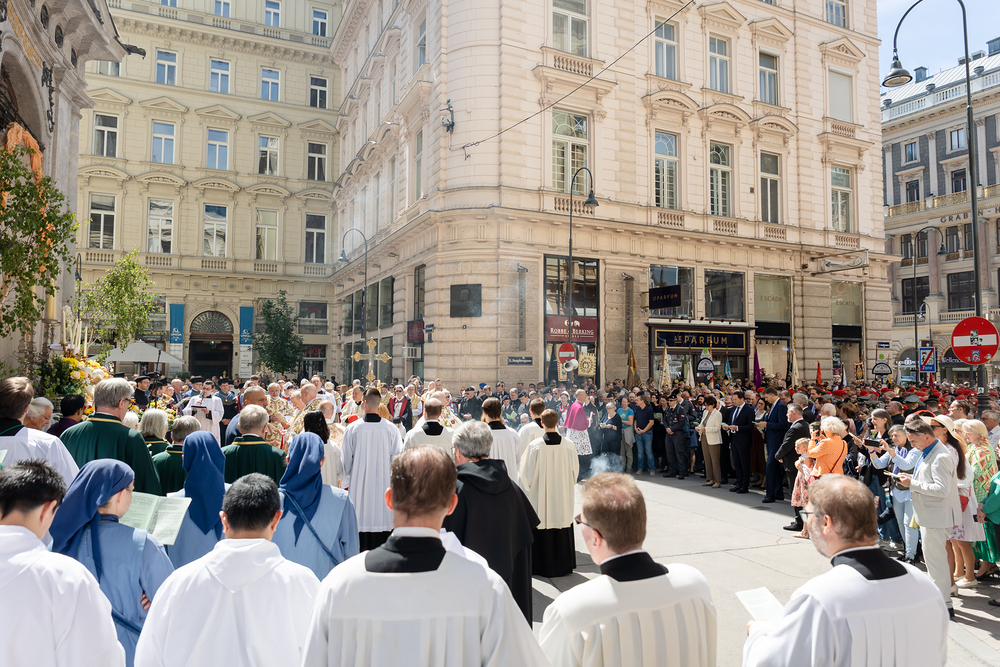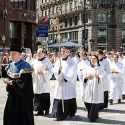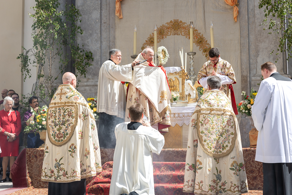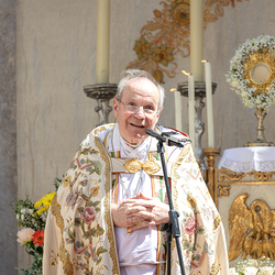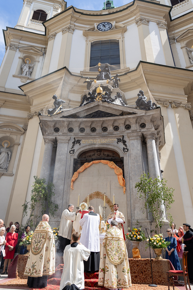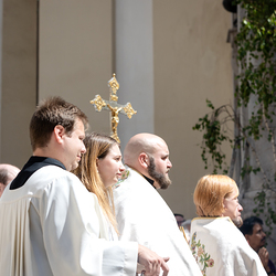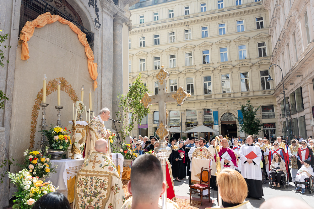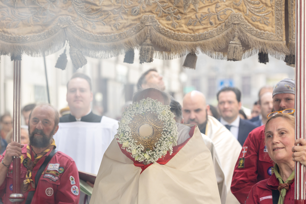 Zu Fronleichnam bringen wir Katholiken öffentlich unseren Glauben zum Ausdruck, dass Gott in Brot und Wein mitten unter ihnen ist. Als sichtbares Zeichen wird eine reich verzierte Monstranz mit einer geweihten Hostie in feierlicher Prozession durch die Straßen getragen.